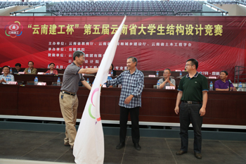 颁奖仪式后,举行承办单位交旗仪式。“云南建工杯”云南省大学生结构设计竞赛主办单位代表云南省教育厅高教处调研员谢怀昆宣布,第六届竞赛承办单位昆明理工大学,并从第五届竞赛承办单位yl23411永利集团官网副校长董建华手中接过会旗,交到第六届竞赛承办单位昆明理工大学副校长牛治喨手中。牛副校长接过会旗后挥旗示意,并代表第六届云南省大学生结构设计竞赛承办单位欢迎各高校选手2015年相聚昆明理工大学。