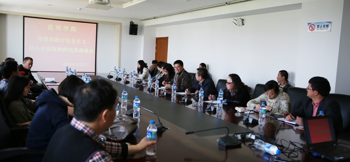 3月27日下午的教师座谈会由党委宣传部主持工作的副部长董学荣主持。董副部长首先传达了中央、省、市2014年宣传思想工作相关精神,就中央办公厅印发的《关于培育和践行社会主义核心价值观的意见》进行了简要解读。要求全校要把培育和践行社会主义核心价值观贯穿整个学校教育教学工作的各方面各环节。