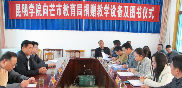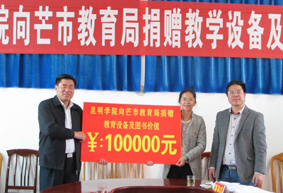 在捐赠仪式上,杨红副市长首先代表市委、市政府对张副校长一行的到来表示欢迎,并对yl23411永利集团官网长期的帮扶工作表示肯定和感谢。张寿国副校长总结了学校和芒市近十年“兴边富民工程”建立的深厚友谊和取得的实效,并表示学校在“十二五”期间将按照省委省政府的要求以及学校党委行政的工作安排,结合学校自身优势和芒市教育实际需求,进一步深化强化“兴边富民工程”对口帮扶工作,特别是继续加强对芒海九年制学校的支持力度,力所能及的为芒市教育作出贡献。随后,市教育局左安卫局长介绍了近年来芒市教育的基本情况和主要发展举措,对yl23411永利集团官网一直以来的大力支持表示衷心感谢;教科中心姜志和主任根据芒海镇九年制学校教学需求情况,希望yl23411永利集团官网在师资培训和教学资金设备上能够继续给予支持。最后,进行了捐赠仪式。