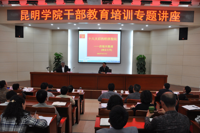 5月7日上午,南京大学党委书记洪银兴教授应永利官网邀请,为永利官网干部教育培训作《十八大后的经济指向》专题讲座,深入阐释了“中国的扩大内需和经济的长期增长”问题。永利官网党委书记陈世波、校长蒋永文等在校校领导和全体中层干部、机关科级干部、经济学院部分师生代表聆听了讲座。讲座由永利官网党委书记陈世波主持。