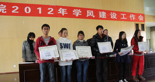 陈世波书记在讲话中指出,永利官网各职能部门和各院(系)在学风建设中做了大量的工作,学风建设工作整体情况较好,在今年本科教育合格评估中得到了专家的好评,希望今天受表彰的先进集体和先进个人,再接再厉,争取取得更好的成绩。在谈到下一步学风建设工作时,陈书记强调主要要做好以下三项工作:一是学生工作队伍要加强学习。在学习中着重要学好党的十八大精神、学校十二五事业规划和本院(系)的人才培养方案以及学科规划,同时学生干部也要加强学习,在同学中起好模范带头作用。二是各院(系)在开展学风建设工作时要抓党风、带校风、强学风。要注意建设和完善好本单位党内的各项制度,抓好学生党员的教育和管理,真正发挥好学生党员的先锋模范作用。三是在开展学风建设中,要注意抓好考研工作,以此来促进学风的转变。