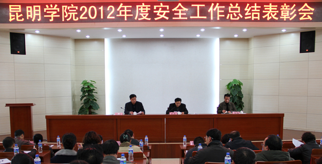 为总结学校2012年安全工作,表彰年度综治维稳平安创建先进单位,部署2013年安全工作,1月23日下午,学校在办公楼D区三楼报告厅召开2012年度安全工作总结表彰会。学校党委副书记孙勇,副校长李翔、张寿国出席会议,各教学院(系)党政领导、分管学生工作副书记及辅导员,各职能部门负责人,保卫处教职工及保安人员共120余人参加会议。会议由李翔副校长主持。
