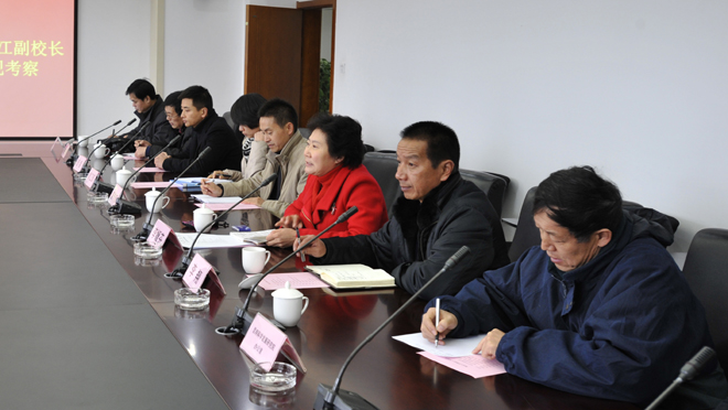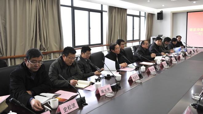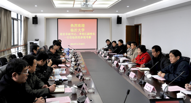 1月10日上午,山东临沂大学党委副书记谢亚非,副校长李培江,率宣传部(统战部)、学工部、工会、团委、招办、离退休工作处、保卫处、图书馆、网络中心、沂蒙文化研究院、外国语学院、传媒学院、音乐学院、马克思主义学院、党办、校办等部门负责人到永利官网参观交流。