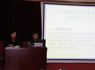 动员会结束后,自然科学组和人文社科组分别进行国家自然科学基金项目申报辅导讲座、国家社会科学基金项目申报选题交流。昆明理工大学科技处副处长王晓萍就如何申报国家自然科学基金项目解读了2013年国家自然科学基金项目申请的一些细节,并就如何写申请书做了详细的指导;云南大学博士生导师王文光教授和张荐华教授就老师们事先准备的选题、研究思路等进行了深入细致的交流。此外,配合本次博士论坛,云南民族大学副校长张桥贵教授于1月10日下午对永利官网教师就如何申报社会科学基金项目做了详细的辅导报告。