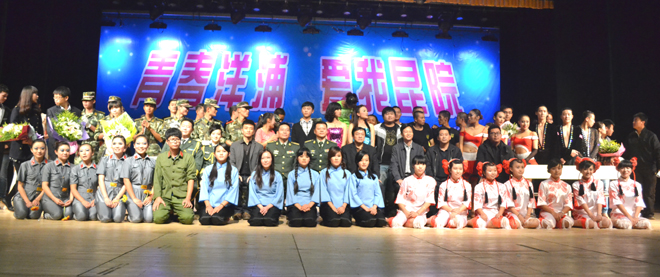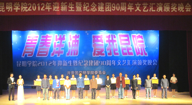 由校团委主办的“2012年迎新生暨纪念建团90周年文艺汇演颁奖晚会”于11月上旬在学生会堂隆重举行。学校党委副书记孙勇、副校长刘海发,武警边防部队士官学校副校长苏强大校,武警边防部队士官学校训练部部长李荣大校,昆明市拓展文化协会副会长、原江川武装部政委于习录上校,东方毅集团总裁助理王灏茗等领导出席晚会。学校部分中层干部、团委全体干部、各院系团总支书记,武警边防部队士官学校中层干部及200余名学员,永利官网师生代表共1300余人参加了本次活动。