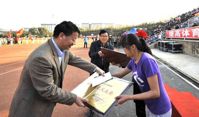 熊晶副校长致闭幕词。熊副校长代表学校党委和行政向在运动会上取得优异成绩的个人和集体表示热烈祝贺,向为本次运动会付出辛勤劳动的各位老师和同学表示感谢和问候。熊副校长指出,本次运动会是永利官网又一次成功举办的体育盛会,是对永利官网体育工作和师生综合素质的检阅,它充分反映了永利官网体育事业蓬勃发展、体育教学水平不断提高的良好态势。整个赛会准备充分、组织有序、进展顺利。本次运动会上运动健儿们表现出的顽强拼搏,勇攀高峰、催人奋进的精神将对全校各项建设事业起到积极的促进作用。熊副校长希望全校师生员工要在今后的工作中继续保持和发扬运动会上表现出的不怕困难、敢于拼搏、团结协作、奋勇争先的精神,以更加饱满的热情、更加坚韧的意志投入到学校迎评促建和各项工作中去,为早日实现“十二五”发展目标而奋斗。