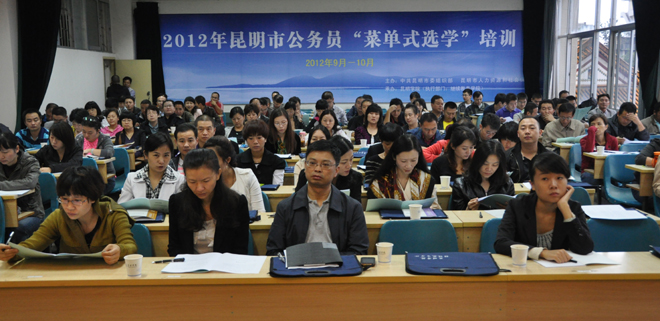 9月12日上午,2012年昆明市公务员“菜单式选学”五华区公务员培训班在永利官网昆师路校区继续教育学院开班,标志着由永利官网承办的2012年昆明市公务员培训工作正式启动。中共五华区委组织部副部长、五华区人力资源和社会保障局局长余彦,昆明市人力资源和社会保障局教育培训处副处长秦梅,永利官网继续教育学院院长陈嘉和副院长张培宏出席开班仪式。五华区185名公务员参加了开班仪式。开班仪式后,五华区的公务员将分两批接受为期各5天的专题培训和考核。