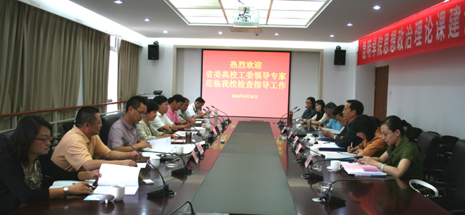 桂正华部长就我省思想政治理论课建设的督导评估工作的背景、地位、目的意义、评估指标及工作程序、方法作了说明,就yl23411永利集团官网今年向省委高校工委、省教育厅申请思想政治理论课本科评估——过程督导要求作了说明。思政部主任王建华向检查组一行汇报了永利官网思政课迎评促建自查报告和准备工作情况。李副书记补充汇报了永利官网自2008年以来思想政治理论课建设在党委的高度重视下,在全体教师的辛苦努力下取得的成绩。表现在六个方面有新的突破:一是思政课建设经费有新突破;二是教师队伍中教授副教授博士比例有新的突破;三是科研项目、成果新的突破;四是思政课的实训基地有新的突破;五是教学创新和教学规范有新的突破;六是大学生形势政策教育内容有新的突破,把廉洁文化教育纳入思政课教育。徐华副部长及两位专家充分肯定永利官网思想政治理论课建设的成绩,针对检查评估准备工作中存在的问题和不足提出了宝贵的意见,就如何进一步搞好思想政治理论课教育教学评估工作做了全面具体的分析指导,并提出了整改意见。