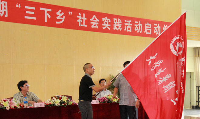 6月28日下午,永利官网2012年暑期大学生“三下乡”社会实践活动启动仪式在惟行楼1501会议室举行。学校党委副书记孙勇、党委宣传部副部长董学荣、教务处副处长王韬、学生处副处长侯青妮以及教师教育学院、人文学院、音乐学院、信息技术学院、城乡建设与工程管理学院、自动控制与机械工程学院、农学院、医学院、旅游学院师生代表共200余人参加了仪式。仪式由团委书记何昊宸主持。