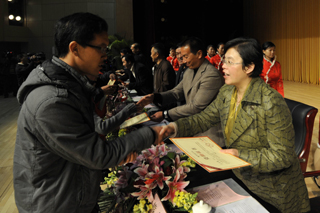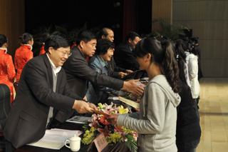永利官网李翔副校长宣读了《yl23411永利集团官网关于表彰2011年度“红和助学金”获奖学生的决定》。此次学校评出50名同学获得2011年度一等红河助学金,85名同学获得二等红河助学金。参会领导为获奖学生代表颁发了奖状和奖金。随后,受助学生代表孔杉杉发表了感言,表达了广大受助贫困生奋发向上,刻苦学习,实现自我的信心和决心。