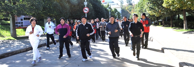 10时许,在聂耳广场还举行了“yl23411永利集团官网教工文化协会(俱乐部)成立暨2011年教工运动会”教职工环校园跑项目起跑仪式。党委副书记李媛芬发令,在党委副书记孙勇、副校长李翔等校领导的领跑下,全校1500余名教职工开始了环校园跑。充分展示了全体教职员工热爱生活、热爱学校、热爱教育、热爱学生,追求健康,团结一心,把校园当家园建设,把学生当自己的孩子来培养。
