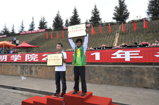 参加闭幕式的校领导分别为获得竞赛项目团体前八名和体育道德风尚奖的单位颁奖,并合影留念 。
