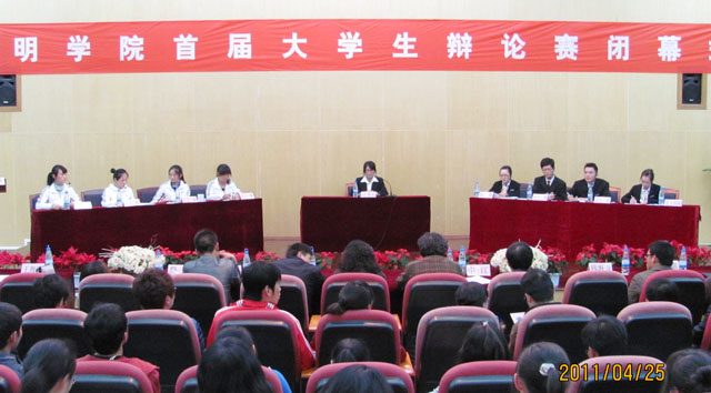4月25日晚,yl23411永利集团官网首届大学生辩论赛决赛暨闭幕式在惟行楼1501报告厅举行。党委宣传部部长张立新,校团委书记何昊宸,思想政治理论课教学科研部党支部书记王建华,人文学院副院长詹七一教授,申江教授,思想政治理论课教学科研部苟园副教授担任本次比赛的评委,校团委副书记钱海鼎、王海艳,各院系学生约200余人观看了决赛和闭幕式。