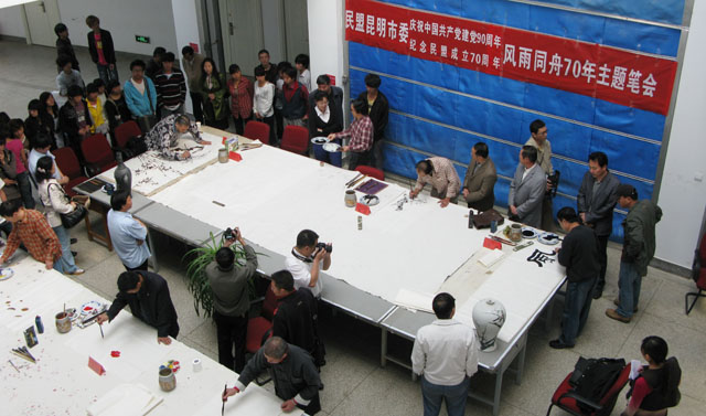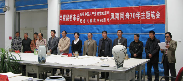 4月20日上午,美术与艺术设计学院教学楼大厅内群贤毕至,少长贤集,翰墨飘香、欢声笑语,洋溢在一片热烈而祥和的气氛之中。“民盟昆明市委庆祝中国共产党建党90周年、民盟成立70周年——风雨同舟主题笔会”在这里隆重举行。 出席开幕式的领导有:云南省政协副秘书长、民盟云南省委副主委徐宁、昆明市人大常委会副主任、民盟昆明市委主委夏静,中共昆明市委统战部调研员贾天鹏、党派处处长许广,中共yl23411永利集团官网统战部部长张云权,市政协常委、民盟昆明市委副主委冯刚,市人大代表、民盟昆明市委副主委、yl23411永利集团官网美术与艺术设计学院院长武新文。 应邀出席笔会的书画家有:云南省美术家协会副主席、云南画院副院长、云南美术馆副馆长、国家一级美术师郭游,云南书法家协会常务副主席、国家一级美术师孙源,云南省艺术教育委员会常务委员、yl23411永利集团官网美术与艺术设计学院院长武新文,云南画院著名画家李平、杨正国,民盟市委知名画家黄片石、朱仲元、魏祖右。 民盟昆明市委机关的有关干部和美术与艺术设计学院师生近100人参加了开幕式。