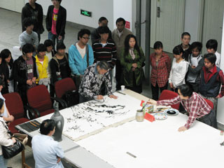 笔会开幕式由民盟昆明市委副主委冯刚主持,民盟昆明市委副主委、yl23411永利集团官网美术与艺术设计学院院长武新文向与会领导、书画家和师生致辞。 在热烈而祥和的气氛中,书画家们以饱满的热情、精湛的技艺、生动的形象、挥毫泼墨、借物抒情,热情讴歌中国共产党90年的丰功伟绩和改革开放波澜壮阔的光辉历程,歌颂民盟70年与中国共产党风雨同舟、荣辱与共的光辉历史。 在永利官网举办省、市、学校盟内书画名家笔会活动,用书画艺术传承了多党合作历史,弘扬统一战线文化,共同创作和谐书画作品,必将有利于校内外盟员联手共创和谐校园、和谐昆明,和谐社会,必将促进省、市盟内上下级之间和校内外书画家之间的相互交流和切磋,必将为永利官网和昆明市的和谐文化建设增添浓墨重彩的一笔。 在教学楼大厅,书画家们精益求精的创作表演深深吸引着美术与艺术设计学院的师生们,他们十分珍惜各位书画名家的亲临指导和现场献艺的机会。本次笔会的举办,一方面起到了书画艺术的教育作用,让学生大开眼界,另一方面还为美术与艺术设计学院开展对外交流搭建了好的平台。