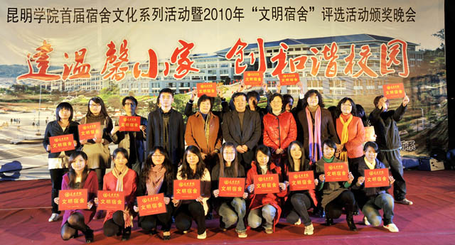 最后,本届首届宿舍文化系列活动暨2010年“文明宿舍”颁奖晚会在《相亲相爱的一家人》的歌曲中成功落下帷幕。孙副书记、李副书记、熊副院长对本次晚会的举办给予了高度评价,并与获奖宿舍及个人上台合影留念。整台晚会气氛热烈,它的成功举办为yl23411永利集团官网首届宿舍文化系列活动暨2010年“文明宿舍”评比活动画上了一个圆满的句号。