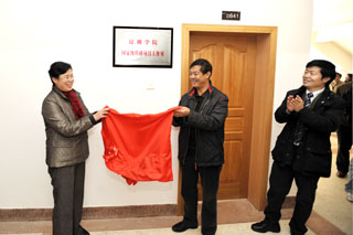 | 11月12日,我院举行“教学名师工作室”和“国家级项目科研工作室”揭牌仪式及座谈会。省教育厅高教处处长王永全、科技处处长赵纯,我院副院长熊晶、罗明东、董建华出席仪式。我院教学名师、获得国家自然科学和社会科学基金项目的教师,各教学单位分管教学、科研工作的领导,青年教师代表、博士代表、教授代表和相关职能部门负责人参加了揭牌仪式和座谈会。