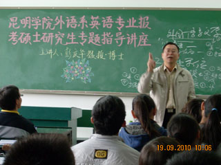 为帮助外语系学生备战硕士研究生入学考试,在外语系领导和团总支的共同努力下,10月26日下午3点, “yl23411永利集团官网外语系英语专业报考硕士研究生专题指导讲座”在yl23411永利集团官网博文楼2--103教室拉开了帷幕。云南师范大学外国语学院副院长、博士、彭庆华教授,亲临现场对我系学生进行指导。外语系有志报考硕士研究生的70多名同学踊跃参与,系主任林德福、团总支书记高玉林老师也参加了本次讲座。