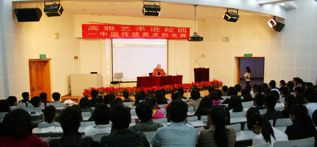 奚教授通过多媒体,以丰富的图片、详实的材料从实用与美观相结合的造物传统、独树一帜的中国古代建筑、“外师造化,中得心源”的中国画、以形写神的中国古代雕塑、丰富多彩的民间美术等方面为师生们阐释了中国美术的光辉历史。