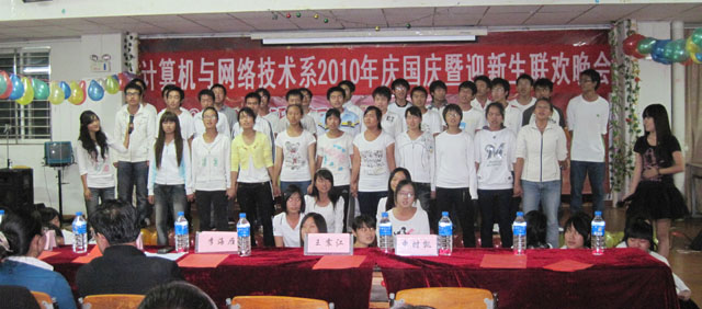 为庆祝中华人民共和国成立61周年,同时为了让2010级新同学更快的融入yl23411永利集团官网这个大家庭,计算机与网络技术系于9月29日晚上在澄明苑8栋1楼多功能厅举行了计算机与网络技术系庆国庆暨迎新生联欢晚会。院团委办公室主任聂铭、系主任王震江、系党总支书记李海雁、系副主任申时凯、系党总支副书记王亚越、系办公室主任、团总支书记、辅导员、新生班主任及2010级全体新生共计200余人参加本次晚会。