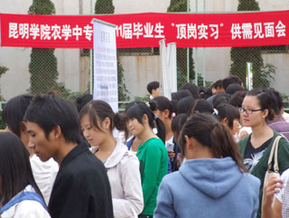 9月3日上午9:00¬—下午4:00,yl23411永利集团官网农学中专部在跑马山教学区举办了2011届第一批毕业学生顶岗实习现场招聘会。参加此次招聘会的共有园林、园艺、畜牧兽医等24个班级1000余名学生,前来招聘的有红塔基地、星海园艺、正大饲料、恒大养殖基地、沃尔玛、南亚风情园等较为知名的54家用人单位。截止当天下午4时,已有950余名学生与用人单位签订顶岗实习协议,推荐成功率达95%以上。