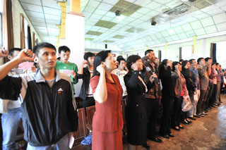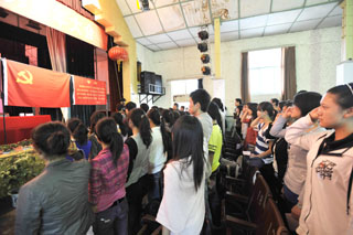 学院党委副书记、纪委书记李媛芬代表党委宣读了《关于确定yl23411永利集团官网创先争优活动示范点的通知》,通知中确定了我院城乡建设与工程管理系、旅游系、生命科学与技术系、外语系、计算机与网络技术系、机关党总支八支部、现代教育技术中心、图书馆8家党总支(支部)为我院首批创先争优活动创建示范点,待今年底考核,明年党委复审后,才能成为正式的示范点。大会当场由院领导为这8家党总支(支部)进行了授牌。大会在庄严的《国际歌》歌声中圆满结束。