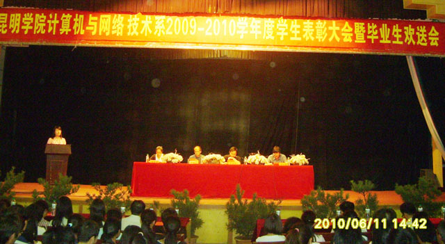 6月11日下午,计算机与网络技术系2009-2010学年度学生表彰大会暨毕业生欢送会在昆师路校区大礼堂召开。系党总支书记李海雁、系主任王震江、系副主任申时凯、系党总支副书记王亚越老师及全系师生共490人参加了会议,会议由系党总支宣传委员李凯佳老师主持。