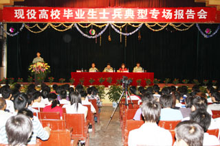 5月21日,我院在昆师路校区礼堂举办“现役高校毕业生士兵典型专场报告会”,这是继我院5月13日举办“yl23411永利集团官网2010年大学毕业生入伍预征宣传讲座”后的第二场入伍预征宣传动员报告会。全院各系600多名学生及辅导员、招就处老师参加了报告会,报告会由招就处何云仙老师主持。
