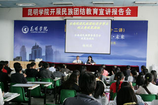 我院为全面贯彻落实省委宣传部《关于组织全省民族团结宣讲活动的通知》精神,根据《中共云南省委高校工委办公室关于协助开展全省民族团结宣讲活动的通知》(云高工办[2010]9号)的安排,结合学院实际,诚邀省委宣传部宣讲团成员、云南省民族事务委员会政策法规处杨剑波处长于4月30日下午到我院作“yl23411永利集团官网民族团结教育宣讲报告会”。报告会由学院党委宣传部张立新部长主持,学院组织部、宣传部、统战部、学生处、团委、各相关教学系的党总支书记(副书记)、辅导员和学生代表聆听了报告。