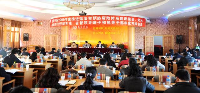我院党委梁晓谷书记代表学院党政领导班子从以下几个方面向考核组和全体到会人员作了《yl23411永利集团官网领导班子2009年度考核综合自查报告》的汇报:一是加强班子自身建设,提高领导学院科学发展的能力和水平;二是发挥领导核心作用,努力开创学院改革发展的新局面;三是推进惩治和预防腐败体系及党风廉政建设,不断增强领导干部拒腐防变和廉洁自律的自觉性;四是以建设平安和谐校园为目标,全面推动综合维稳工作,为学院改革发展创造和谐稳定的条件。