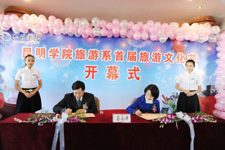 开幕式上昆明市旅游局局长黄峻峰代表省市旅游行政管理部门致辞,他首先肯定了旅游系成立20多年来为旅游业输送了大批人才,其中一部分已经成为我省旅游业界的骨干。目前,云南省尚无国际知名的品牌酒店,应努力在酒店建设管理、新景区开发、景点建设等方面整合旅游资源,提升旅游业整体效益,创新旅游产品,如高尔夫旅游、休闲旅游等,促进旅游二次创业的发展。希望yl23411永利集团官网旅游系在办学过程中加强与各企业之间的沟通及协作,并充分发挥自身优势,为云南省、昆明市大力发展旅游业提供更多智力支持和人才保障。