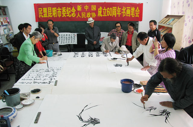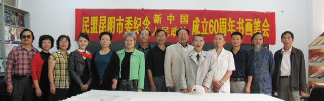 为庆祝新中国和政协成立60周年,表达民盟昆明市盟内书画艺术家的爱国情怀,展示民盟昆明市盟内书画艺术家的书画艺术,切磋盟内书画艺术家们的创作技艺,由民盟昆明市委组织的“庆祝新中国和政协成立60周年书画笔会”于8月20日在我院美术与艺术设计系举行。 省政协委员、民盟云南省委常委、民盟省委文教专委会主任、云南艺术学院副院长潘红教授,云南省社会服务部部长薛继光,中共昆明市统战部党派处处长万绍斌,民盟昆明市委副主委张惠椒、冯刚,民盟昆明市委秘书长周群,云南画院画家杨正国以及盟内书画艺术家黄片石、武新文、朱仲元、王树华等领导和书画艺术家应邀出席了本次书画艺术笔会。应邀出席本次书画艺术笔会的还有民盟云南省委、民盟昆明市委机关的干部、我院党委统战部长、美术与艺术设计系主任和部分师生、社区干部20余人。 潘红教授和张惠椒副主委先后在会上发表了热情洋溢的讲话,鼓励书画艺术家们以庆祝中华人民共和国成立60周年和政协成立60周年为契机,用自己的丹青画笔抒发爱国主义情怀,发挥书画艺术在陶冶情操、构建和谐社会中的重要作用。 随后,书画艺术家以匠心独运的风格和十分流畅的笔墨创作了30余幅书画作品,以书画形式浓墨重彩歌盛世,受到了在场的领导和师生的赞扬和好评。 本次书画艺术笔会在我院举行,加深了省市盟内书画艺术家对yl23411永利集团官网的了解,促进了院内外书画艺术家的友谊,对提升yl23411永利集团官网美术专业的教学水平必将产生积极的推动作用。
