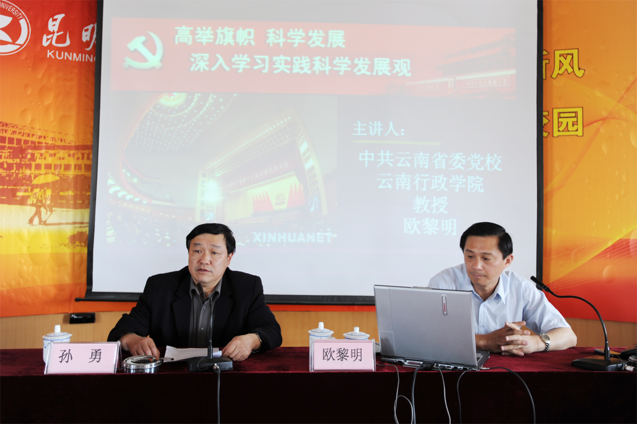 欧教授深入分析了了解科学发展观时代背景的重要性,阐述了科学发展观在中国特色社会主义理论体系中的地位,以及作为理论成果与其他理论成果的关系。同时他结合云南与昆明实际,讲述了科学发展观中,发展是第一要义,大力推进自主创新,加快经济结构战略性调整的必要性。他还结合高校的实际,提出高校是培养人、塑造人的地方,提高全民族的素质,很大程度上都要依靠学校教育,科学发展观中以人为本的核心要不折不扣地体现在教育的各个方面。