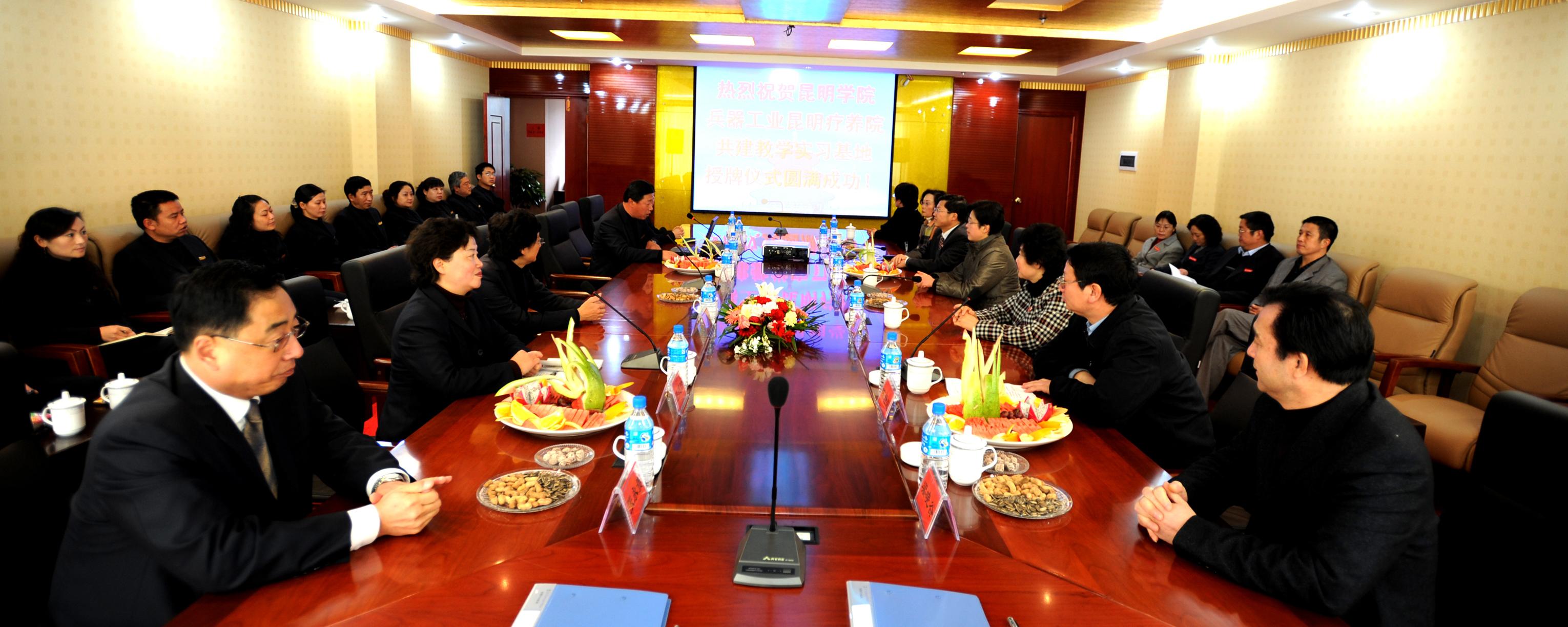 陈院长在简要介绍了我院情况后指出,学院应用型本科的定位对学生实训、实习的要求更高了,能和兵器工业昆明疗养院这样知名企业合作共建教学实习基地,是我院的幸事,有助于我院教学科研水平和学生实际动手能力的提高。并希望兵器工业疗养院在学生实习过程中,对学生多指导、多帮助,提出意见和建议,以促进我院学生实习工作不断改进和发展。