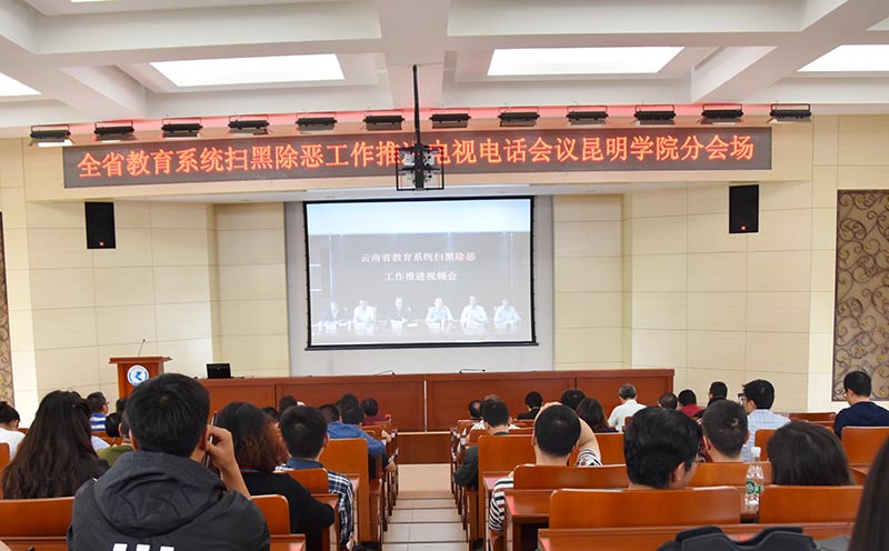 4月29日下午,云南省教育系统扫黑除恶工作推进电视电话视频会议召开。yl23411永利集团官网在办公楼D区三楼报告厅设分会场,学校党委书记陈永明,校长黎素梅等全体校领导。学校各职能部门和二级学院领导,经开区教育局所属中、小学和幼儿园领导,保卫处全体人员及云南飞虎保安公司驻校保安大队业务骨干共120余人在分会场参加会议。