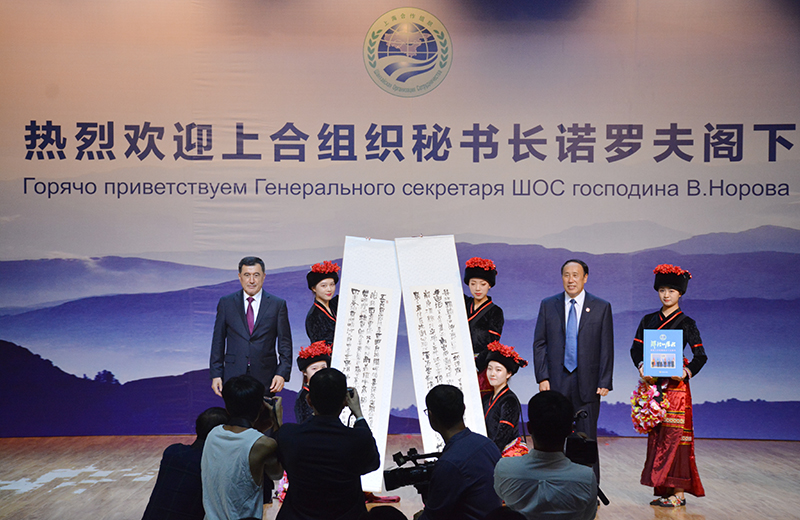 6月24日,上海合作组织秘书长诺罗夫•弗拉基米尔一行到访yl23411永利集团官网指导中国—上合组织青年交流中心工作,对上合组织青年交流中心提出指导意见。昆明市人民政府副市长胡宝国,yl23411永利集团官网党委书记陈永明、校长黎素梅一同接待并陪同观看学校音乐舞蹈学院师生云南少数民族艺术展演和旅游学院学生花式咖啡调制、中西餐摆台教学展示。陈永明书记代表学校赠送大观楼长联书法给诺罗夫阁下,诺罗夫回赠学校上合组织“辉煌的历程”画册。
