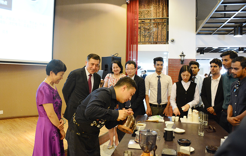 诺罗夫秘书长饶有兴致的观看学生手工咖啡调制,对同学调制咖啡的技艺给了高度赞誉。他说,贵校各位师生的展演非常精彩,技艺高超,非常好,老师的教学非常实用新颖。