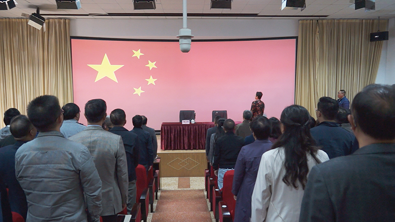 仪式开始,全体与会人员齐唱国歌。1949年9月27日,全国政协第一届全体会议通过决议,将永利官网杰出校友聂耳作曲的《义勇军进行曲》定为代国歌,70年后的今天,我们齐唱国歌,向我们的校友——人民音乐家聂耳致敬,庆祝新中国成立70周年。在激昂嘹亮奋进的国歌声中,yl23411永利集团官网奏响“不忘初心、牢记使命”主题教育学习的序曲。