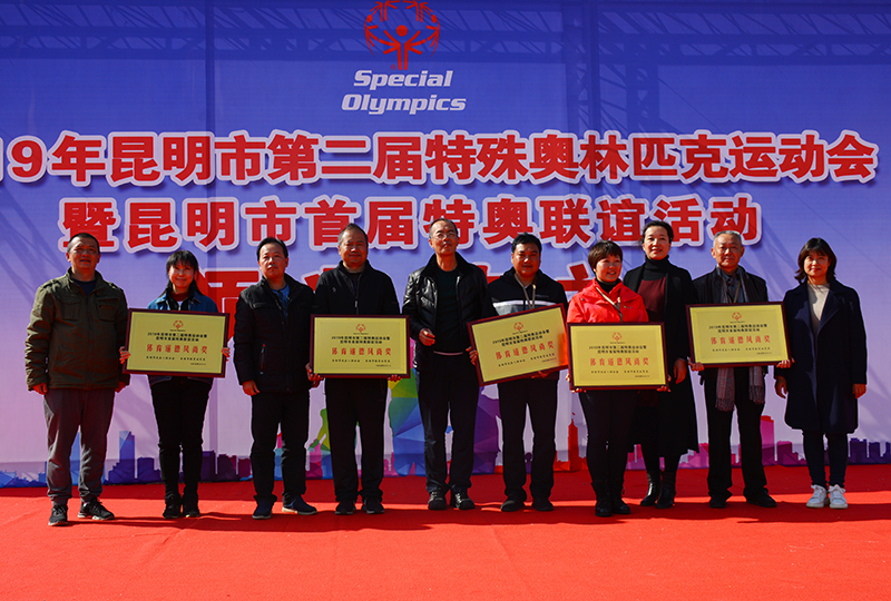 运动员代表、裁判员代表分别宣誓;特奥运动组委会向yl23411永利集团官网学前与特殊教育学院、体育学院、医学院和云南美丽康发展有限公司赠予锦旗;组委会授予盘龙区培智学校、五华区新萌学校、官渡区培智学校、宜良县特殊教育学校、寻甸县特殊教育学校优秀组织奖称号。