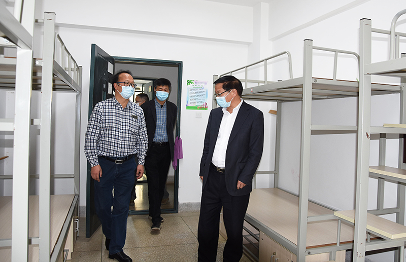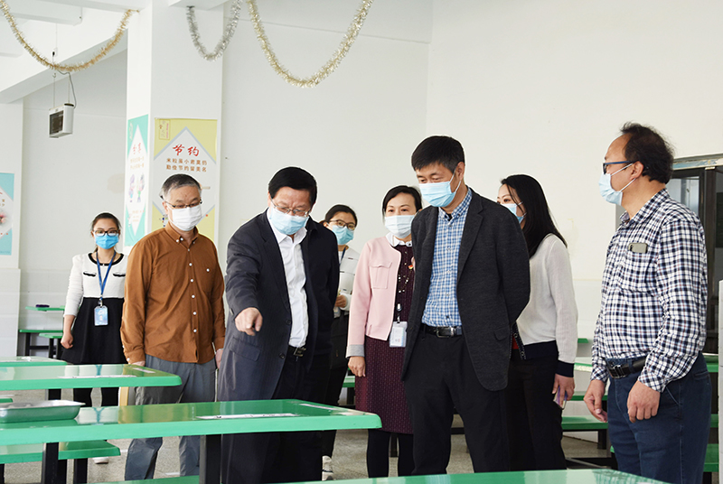 李河流主任等一行先后查看学校门卫、校园卫生防疫、教室、食堂、学生公寓等人员密集公共场所,详细了解学校防疫措施落实、防疫物资储备及防疫隔离应急处置室建设等情况。对附属经开学校开学准备工作、学生错峰进出校园、学生错时用餐、学生课间安全管控、防疫物资管理等具体疫情防控工作给予了充分肯定。
