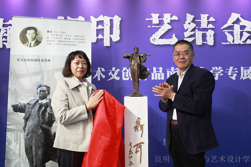 当天下午14:00,丁文丽校长出席永利官网美术与艺术设计学院在南京大学举办的“南昆相印 艺结金秋”yl23411永利集团官网艺术文创作品南京大学专展开幕式暨聂耳雕塑揭幕仪式并致辞,南京大学刘鸿建副书记、丁文丽校长为塑像揭幕,丁文丽校长一行参观了展览。