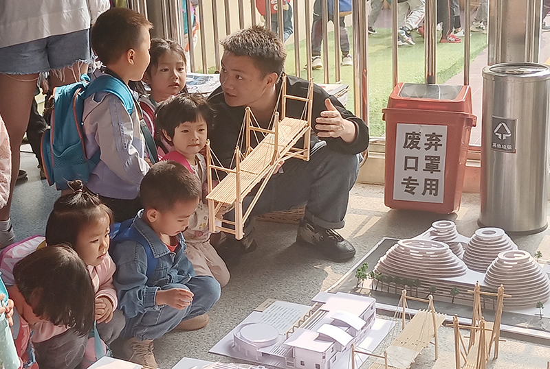 在幼儿园里,志愿者们受到了幼儿园老师和小朋友们的热烈欢迎,小朋友们稚嫩的欢迎声,让志愿者们倍感欣喜。学院志愿者向附属幼儿园捐赠了7件建筑学专业和土木工程专业学生参加公益文化节亲手制作的模型作品,志愿者们绘声绘色为小朋友们讲解了建筑模型的设计理念,并将绿色环保理念生动融入其中。小朋友们真挚渴望的眼神以及对新事物的好奇心和探索欲,让大哥哥、大姐姐们讲解得格外用心、细致。随后,志愿者们来到大班的小朋友中,通过做游戏的方式引导大家说出自己心中的天安门或者小学的样子,并和志愿者们共同在彩纸上画下“心中的天安门”和“心中的小学校”。小朋友与志愿者们现场互动的氛围欢声阵阵、其乐融融。