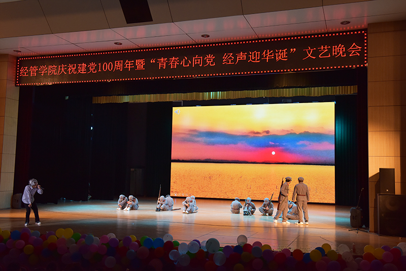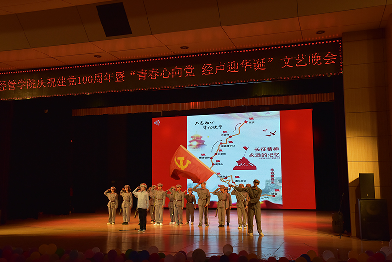 经管学院党委副书记鲍鲲老师致开幕辞,党的百年征程,是无数革命先烈用身躯铺就的前进之路,是无数仁人志士用真理镌刻的壮丽史篇。百年风雨,百年风华,中国共产党带领着一代代的中国人民从站起来、富起来,再到强起来。作为新时代的青年,更要不忘党史、不忘初心、努力拼搏、用实际行动践行当代人的家国使命。晚会现场主题鲜明,气氛热烈。节目形式多样,现代舞、古典舞、民族舞;独唱、大合唱;舞台剧、话剧等都全力的演绎青春风华,传递爱国热情。经济管理学院团委学生会参加学校“百年党史红色故事展演”获得一等奖的舞台剧《风雪长征路》,作为晚会点睛之作,再现长征难,再演长征苦,催人泪下,传递和弘扬长征精神。古典舞《忆青衣》、《书简舞》带领同学们领略传统文化之绝美;情景剧《最初的信仰》高歌消防员舍小家顾大家的奉献精神,向这些平凡而又伟大的英雄致敬。晚会在《我和我的祖国》的大合唱中走向高潮,全场同学激昂高歌,共赞盛世。