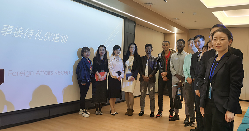 9月9日,yl23411永利集团官网国际学院陆向红、董丹晔两位老师为自贸区服务大厅涉外接待讲解组、业务组的相关工作人员和留学生代表进行了一次外事接待礼仪特色培训。培训从学习外事接待礼仪的必要性、外事接待工作的基本原则、外事纪律的原则、外事接待礼仪的原则及外事接待的形式等方面,应用生动有趣的案例,为自贸区的接待服务人员进行了现场讲解。