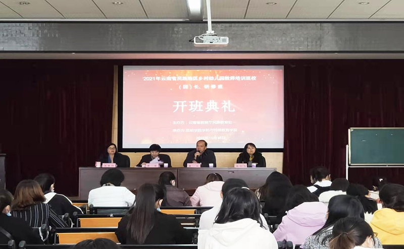 10月15日—月19日,云南省教育厅民族教育处主办,yl23411永利集团官网学前与特殊教育学院承办的2021年度民族地区幼儿园教师培训班顺利举办。此次培训学员为来自云南省16个地州民族地区的乡村幼儿园园长、中心校长、骨干教师,共计90人。云南省教育厅民族教育处处长董一凡、调研员李宇飞,yl23411永利集团官网学前与特殊教育学院院长唐敏出席开班典礼,学前与特殊教育学院副院长高春玲主持。