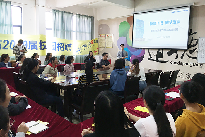 江苏新晨医药有限公司,是江苏恒瑞医药股份有限公司的全资营销公司。承担集团生产的麻醉、镇痛、肌松、镇静、呼吸、抗生素、胃肠营养、肝病及中成药产品等系列产品的市场推广,是我国手术用药系列产品的主要供应商之一。新晨医药公司人资主管张洪程从我们是谁、为什么选择我们、我们需求哪些人才、如何加入我们这四个方面进行了宣讲。向参会同学详细介绍了新晨医药的公司现状、发展前景、产品优势、岗位需求、待遇福利以及各职业发展通道。针对同学们提出的疑问,新晨医药公司人资主管也给予了耐心细致的解答。在新晨医药工作的化科系2015届优秀毕业生杨敏超向学弟、学妹们分享了自己在新晨医药工作的心得体会。新晨医药销售经理冯凡表示公司欢迎能吃苦、务实的大学生。宣讲会结束后,同学们纷纷向招聘负责人投递简历,新晨公司对参会同学进行了现场面试。面试中,同学们5人一组依次向招聘负责人作了精心准备的自我介绍,然后是接受面试老师提问,最终11名同学脱颖而出,成功通过新晨医药公司初试。