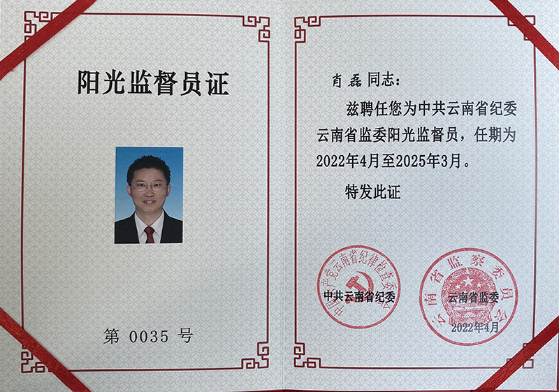 4月26日,中共云南省纪委省监委阳光监督员聘任仪式在云南省委举行,中央纪委委员、云南省委常委、云南省纪委书记、监委主任冯志礼出席会议,为阳光监督员颁发证书并发表讲话。永利官网民革支部主委、昆明滇池(湖泊)污染防治合作研究中心副主任肖磊参加会议并受聘担任阳光监督员。