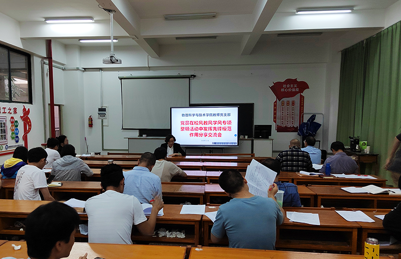 7月1日,物理科学与技术学院党委在惟真楼1113举办了“党员在校风教风学风专项整顿活动中发挥先锋模范作用”的分享交流会,学院全体党政班子,全体教职工参加。学院党委书记付晏昆主持分享交流会。