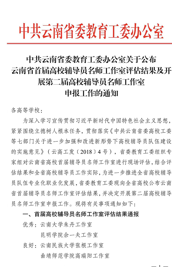 为深入学习宣传贯彻习近平新时代中国特色社会主义思想,紧紧围绕立德树人根本任务,省委教育工委组织专家对云南省高校首届辅导员名师工作室进行现场评估,永利官网云南省首届高校辅导员名师余一夫工作室在本次评估中荣获优秀。
