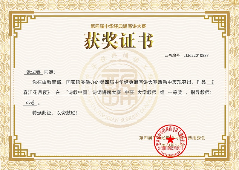 近日,教育部公布了第四届中华经典诵写讲大赛获奖名单,永利官网云南省国家通用语言文字推广基地骨干成员、人文学院教师张迎春参赛作品《春江花月夜》,获得“诗意彩云南” 诗词讲解大赛省级一等奖,并从全国1105件入围作品中脱颖而出,荣获“诗教中国”诗词讲解大赛全国一等奖;人文学院教授邓瑶荣获全国优秀指导教师奖;人文学院学生武彩丽书法作品《岳阳楼记》先后获得“墨香彩云南”汉字书写大赛省级一等奖、“笔墨中国”汉字书写大赛全国优秀奖,实现了yl23411永利集团官网参加该类比赛的历史性突破。